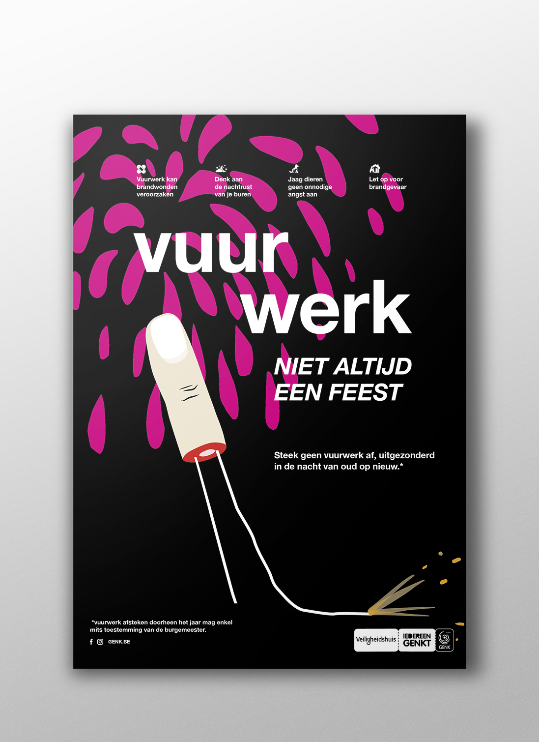 For the safety departement of stad Genk. The client asked for imagery that was explicit and discouraging and that showed the negative effects of careless use of fireworks. We chose to use illustration rather than gruesome imagery.